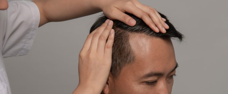 Male pattern baldness is so named because it appears in a common pattern, beginning with a receding hairline at the temples creating an M pattern, progressing to diffuse thinning of the hair at the front and center, and eventually hair loss at the crown.